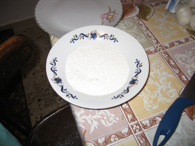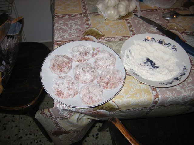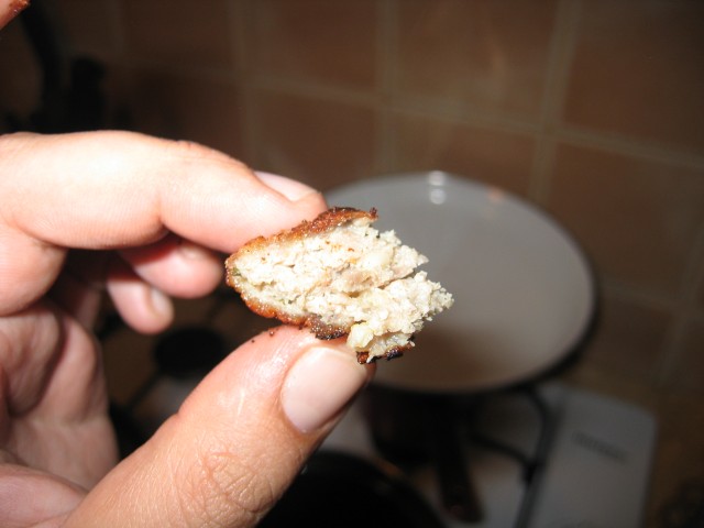 Se ia intr-o lingura cata compozitie incape, si se face ca o mogaldeata. Se rostogoleste prin faina iar apoi se preseaza in causul palmei, incat sa iasa rotunda si... ca o chifteluta. Iat-o pe prima! (mi-a iesit cam ... colturoasa  :-[ )