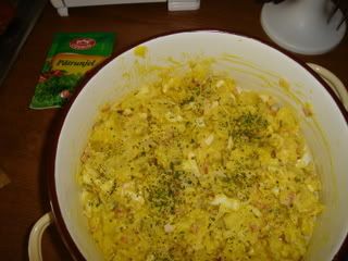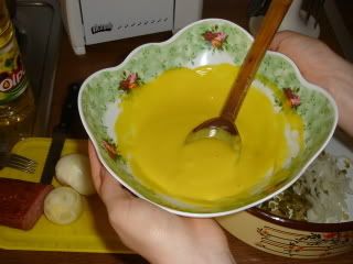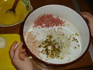 Primul pas:In timp ce am pus la fiert 2 oua si cartofii vom pregati maioneza astfel:intr-un castron punem un galbenus de ou si il amestecam cu o lingurita de mustar.Dupa ce am amestecat bine incepem sa punem ulei cu grija ,putin cate putin si mestecam continuu intr-o singura directie ca sa nu se taie.