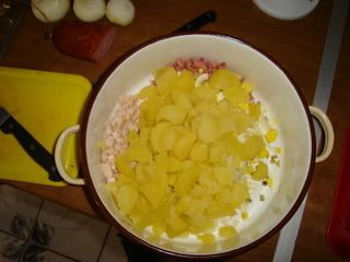 Adaugam maioneza atunci cand cartofii s-au racit ca sa nu se taie.De asemenea adaugam sare dupa gust si mancarea este gata.