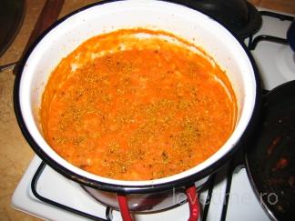 Se adauga oregano, poate niste chilli (peperoni) - 2 ardeiuti mici, sau piper macinat si se mesteca iar.